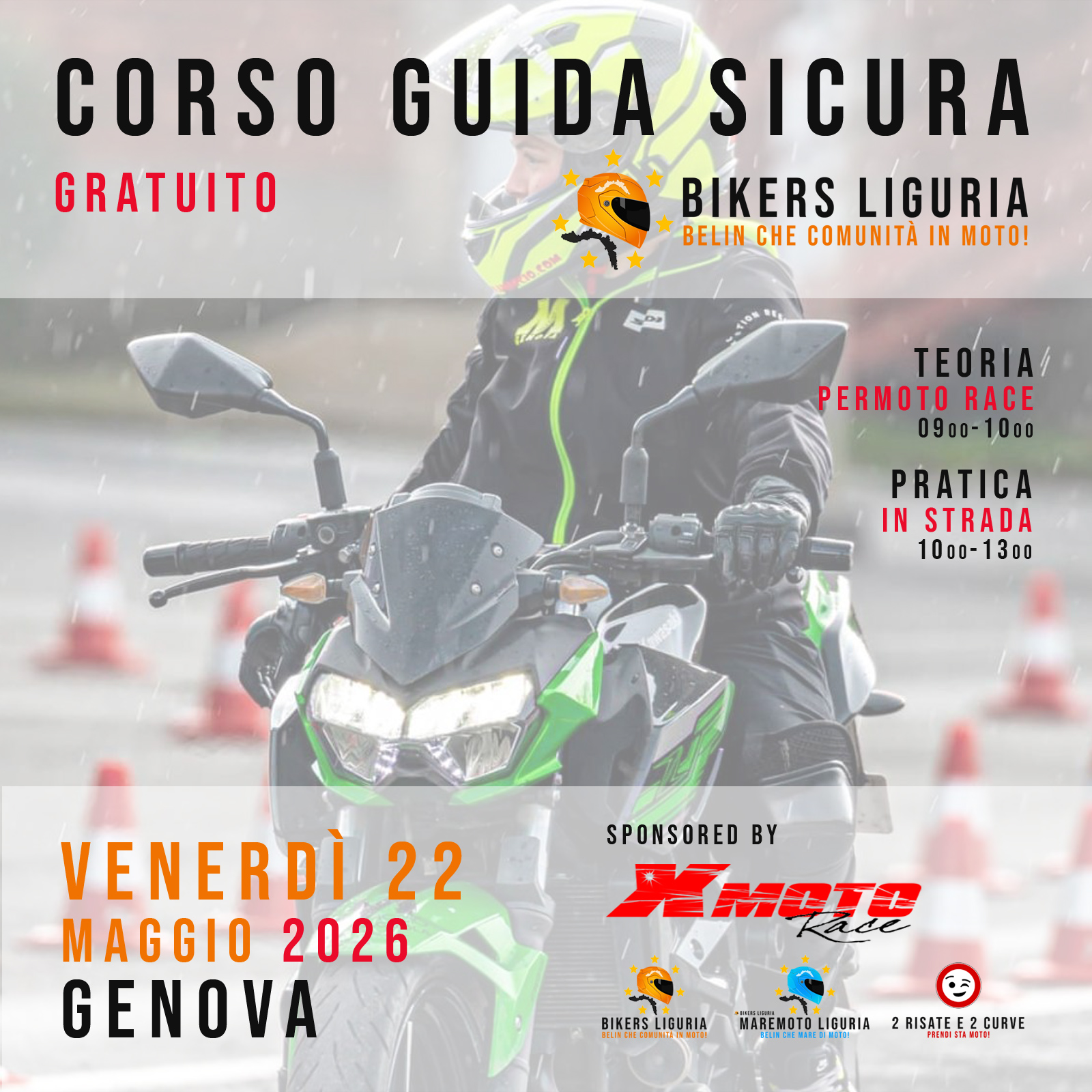 Corso di guida sicura gratuito per 5 membri della community, tenuto da AUTOSCUOLA MACCIÒ e sponsorizzato da JANUA - HONDA. Teoria presso il concessionario e sessione di pratica nell'entroterra di GENOVA. Corso aperto a tutti i brand.